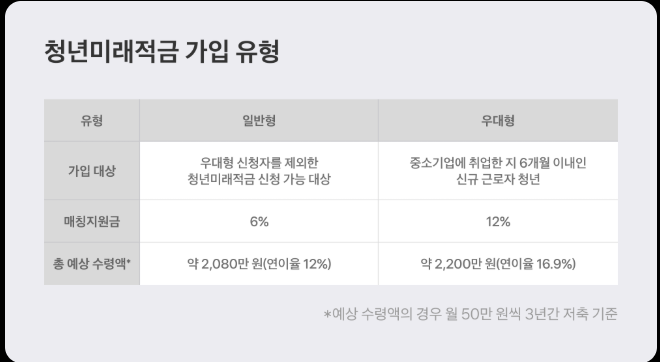 만기수령액의 기준으로는 청년미래적금 3년간 50만원 납입 시 일반형 약 2,080만원, 우대형 약 2.200만원